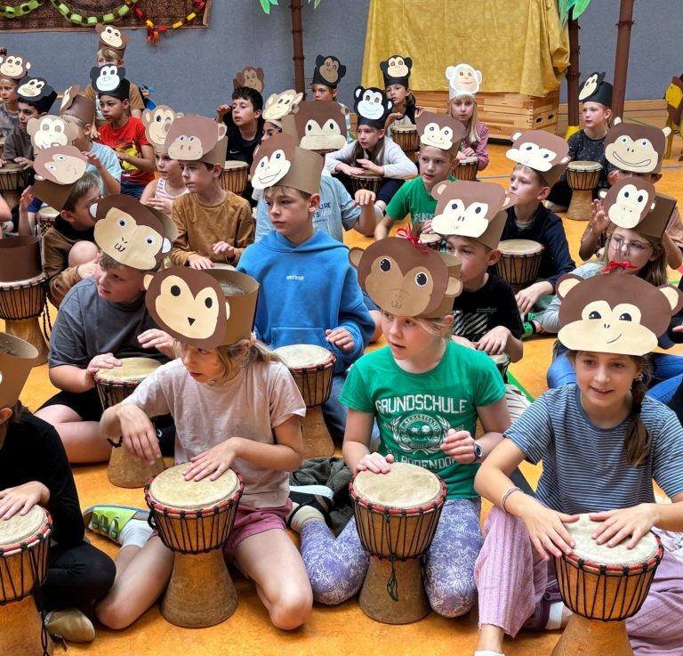Im September wurde unsere Turnhalle eine Woche lang zum Mittelpunkt einer besonderen Reise: 134 Kinder unserer Schule begaben sich gemeinsam mit ihren Lehrerinnen und Lehrern unter der Anleitung des Trommelmeisters Fara auf eine musikalische Reise nach Afrika.